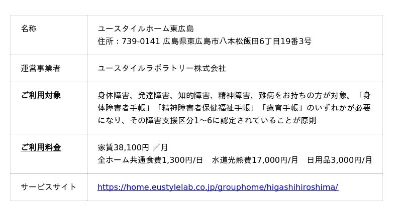 「すべての必要な人に、必要なケアを届ける。」をミッションに、重度訪問介護事業や障害者グループホーム事業を中心とした重度障害・難病者向け介護サービスを全国に届けるユースタイルラボラトリー株式会社(本社:東京都中野区、代表取締役:大畑健)は、重度身体・知的・精神障害者の居場所不足解消へ向け、2025年11月1日、当社として広島県で初となる日中サービス支援型グループホーム「ユースタイルホーム東広島」(〒739-0141 広島県東広島市八本松飯田6丁目19番3号)を開設しました。