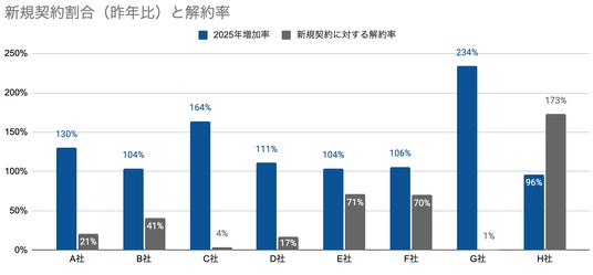 2025年に導入のあった医療機関を調査したところ、リプレイス(乗り換え)による導入が大幅に増加し、さらにシステム移行やサービス終了に伴う解約も確認されました。成長企業が躍進する一方で、減少・停滞する企業との差が拡大し、競争はより激化しています。