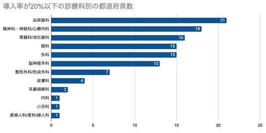 また、主たる診療科別に「診療予約システムの導入率が20%未満の都道府県がいくつ存在するか」を主たる診療科別に集計したところ、泌尿器科(21都道府県)、精神科・心療内科(18都道府県)、胃腸科/消化器科(16都道府県)等となりました。