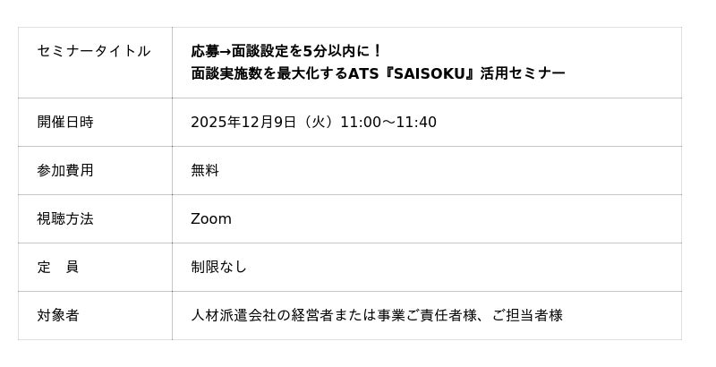 多くのご要望を受け、「応募→面談設定を5分以内に!面談実施数を最大化するATS『SAISOKU』」活用セミナー」のアーカイブ配信を公開いたします。