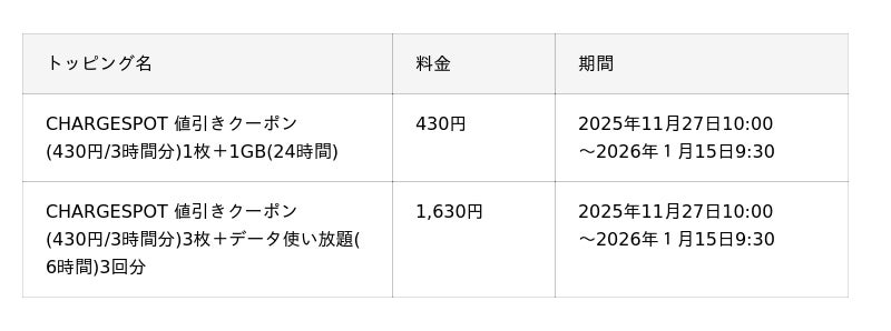 KDDI、沖縄セルラーは2025年11月27日から、povo2.0の「コラボトッピング」として、「CHARGESPOT (チャージスポット)」でご利用いただける「CHARGESPOT 値引きクーポン(430円/3時間分)1枚」と「1GB(24時間)」のセットを430円、「CHARGESPOT 値引きクーポン(430円/3時間分)3枚」と「データ使い放題(6時間)3回分」(注1)のセットを1,630円で提供します。