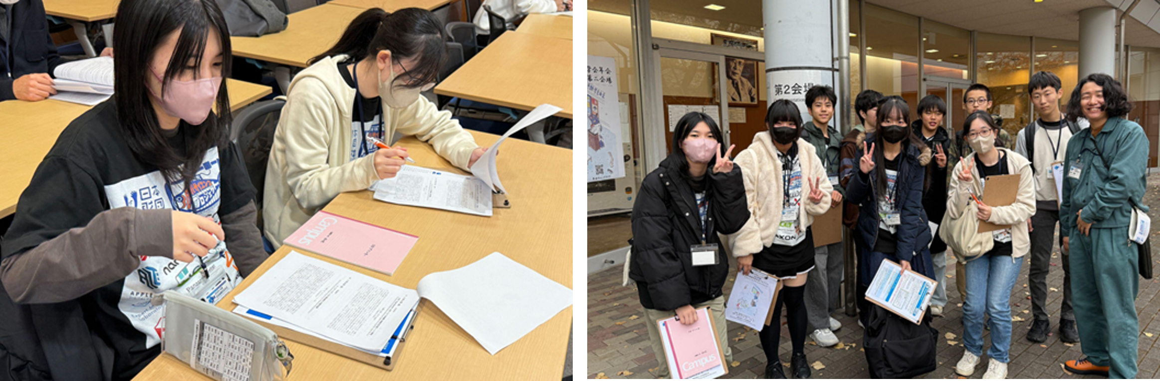 最新の研究成果が次々と発表される中、会場に張り詰める心地よい緊張感に包まれながら、スクリーンを見つめ、聴き入る研究生たち。事前に講演要旨集を読んで予習して臨みましたが、研究者の生の声を「聴講」することは全く別の体験です。論理的な説明の端々からにじみ出る熱意や、研究の社会的意義の重みが、研究生たちの心に深く刻まれました。