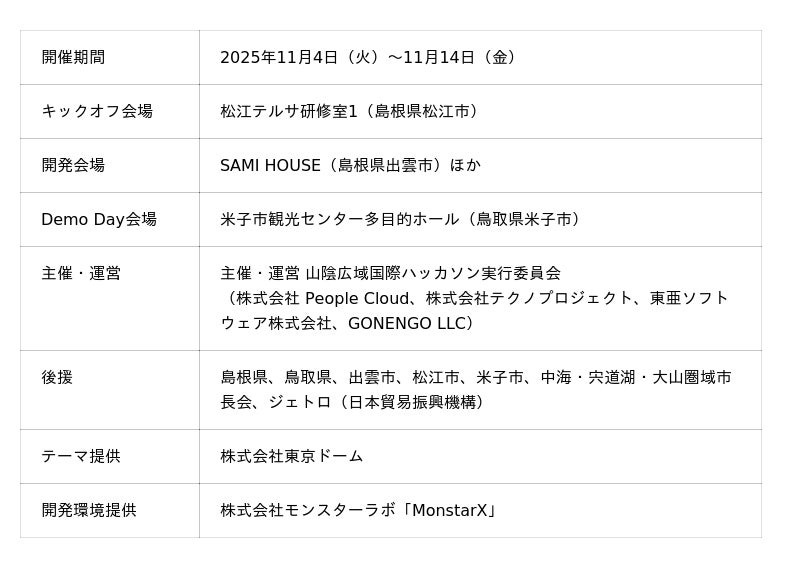 「Hack Yakumo 2025」は、島根・鳥取の産官学民が連携し、地域課題の解決とグローバル共創を目的として開催された国際ハッカソンです。国内外のエンジニアや学生、企業人材が5つのチームに分かれ、それぞれアイデア創出からプロトタイプ開発までを10日間のハッカソン期間内で実施しました。