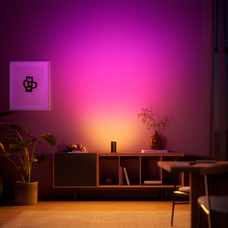 ColorCast(TM)(カラーキャスト)テクノロジーにより、照明が壁から離れていても色が薄まることがなく、鮮やかな色彩を保ちます。また、1台で複数の色を滑らかなグラデーションで表現します。