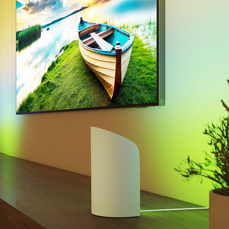 1台で複数の色をなめらかなグラデーションで発色する置き型の間接照明です。TVの両脇に置き、TVバックライトとしてもおすすめです。コンパクトな本体で場所を取らず、他のTVバックライト(*1)と比べて2倍の明るさと3倍の広さを誇る照射範囲で、ホームシアターの演出として最適です。
