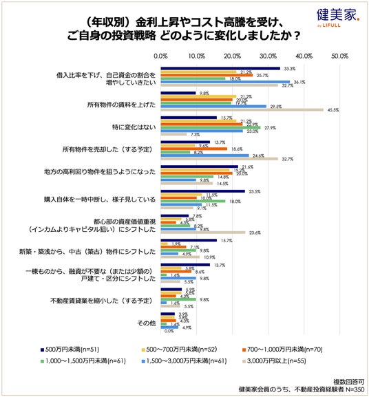 - 投資戦略の変更:年収1,500~3,000万円未満では「借入比率を下げ自己資金を増やしたい」(36.1%)、「賃料を上げた」(29.5%)、「売却した(する予定)」(24.6%)が全体より高く、年収3,000万円以上では「賃料を上げた」(45.5%)、「売却した(する予定)」(32.7%)、「都心の資産価値重視にシフト」(23.6%)が目立つ。