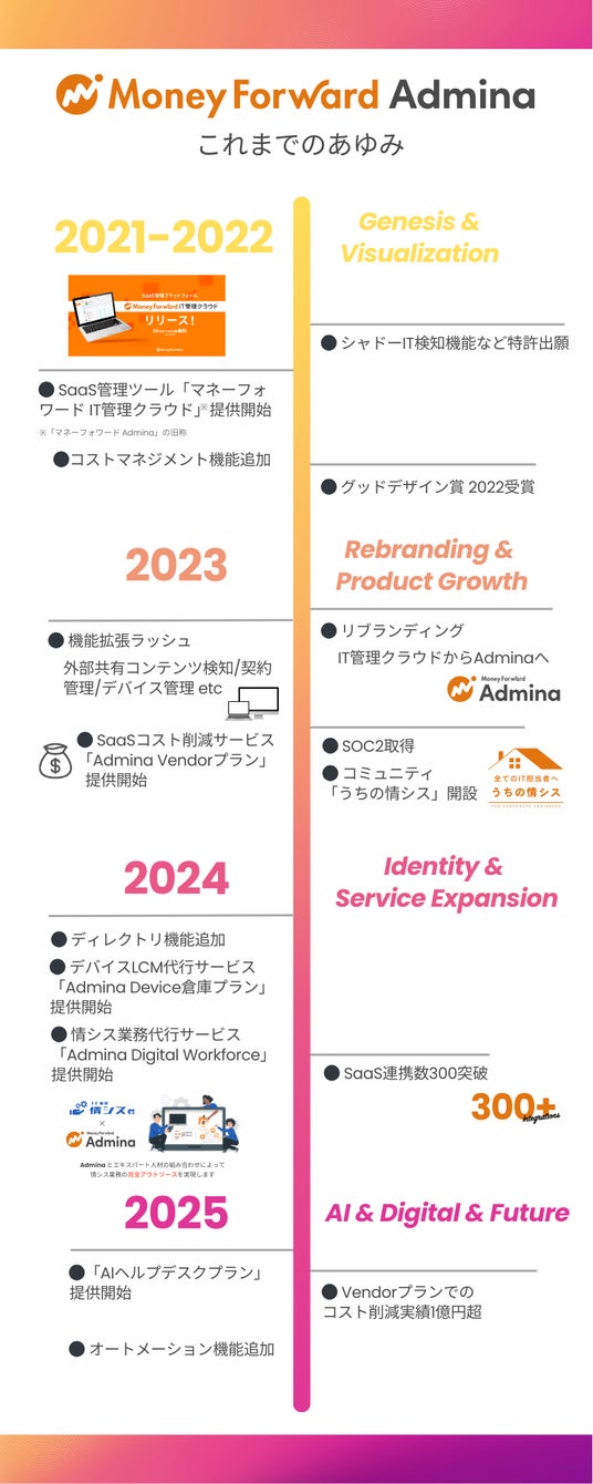 株式会社マネーフォワードのグループ会社であるマネーフォワードi株式会社が提供する『マネーフォワード Admina』は、2025年11月をもってサービスの提供開始4周年を迎えました。これを記念し、これまでのプロダクトの進化と、これからの展望をまとめたインフォグラフィックを公開します。