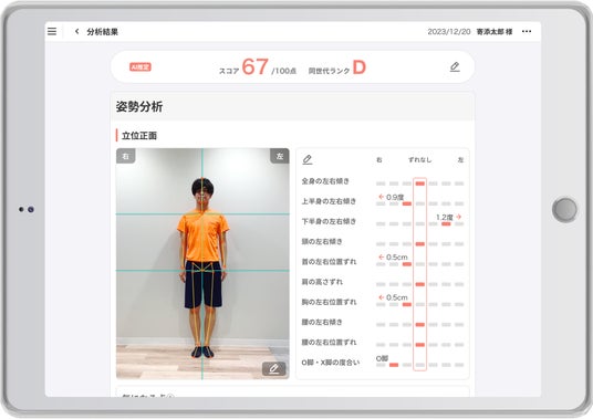 ■ カルティ シセイカルテタブレットで数枚の全身写真を撮影するだけで、AIが姿勢を分析し、スコアやグラフでわかりやすく可視化するシステムです。客観的かつパーソナライズされた分析結果に基づき接客を行うことで、顧客の納得感や興味を醸成し、施術提案の説得力向上に貢献します。