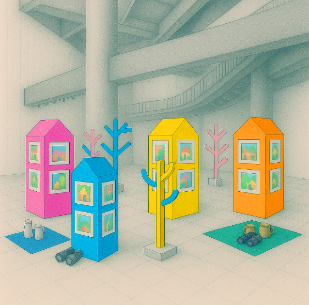 会期中のワークショップ|みんなのまどでつくるまち原田さんが継続して制作してきた”まど”というテーマから、子ども向けのワークショップを開催します。ワークショップでは、「まどから見える景色」を描きます。展覧会の会期中描いた絵は“家のまど”になって、展示室の吹き抜け空間にカラフルでにぎやかな街が広がります。