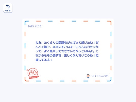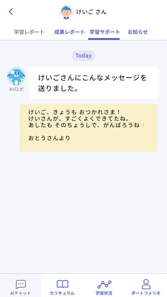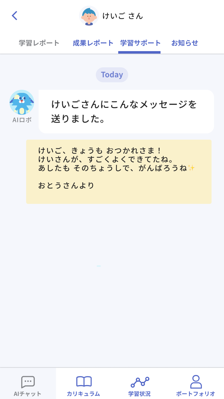 保護者の方からお子さまへ直接メッセージを送る機能を追加することで、お子さまの「できた!」をたくさん見つけて、応援できる環境をサポートします。