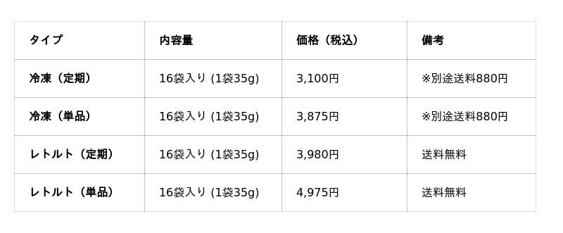 - タイプ:冷凍、レトルト(常温)