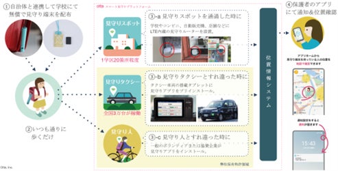 児童が見守り端末を携行することで、見守りスポット(固定基地局)通過時や、スマートフォン等のスマートデバイスに専用のアプリケーションをインストールした見守り人や車等の移動基地局とのすれ違い時の位置を記録。その位置情報の履歴を保護者が確認できるサービス。