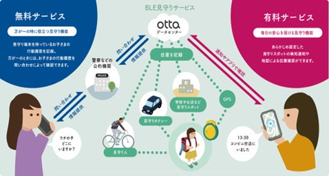 ottaが提供するIoTを活用した地域参加型のタウンセキュリティサービス『otta(おった)』は、専用端末を携帯する子どもが、域内に設置された「見守りスポット」や「見守り人※1」付近を通過することで位置情報が記録されます。