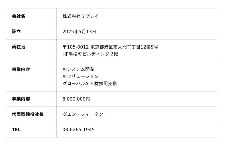 本年、株式会社エイチビーラボ(本社:〒105-0012 東京都港区芝大門2丁目12番9号 HF浜松町ビルディング2階、代表取締役:グエン・フィ・タン、以下、HBLAB)はAI事業に特化した戦略子会社株式会社ミグレイ(本社:〒105-0012 東京都港区芝大門2丁目12番9号 HF浜松町ビルディング2階、代表取締役:グエン・フィ・タン、以下、Migurei)を正式に設立しました。