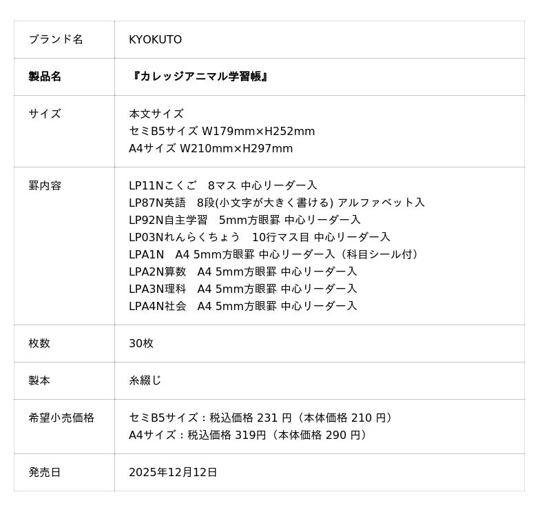 この度KYOKUTOブランド『カレッジアニマル学習帳』より、8アイテムを2025年12月12日より順次発売いたします。
