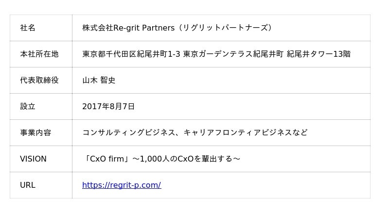 株式会社Re-grit Partners(リグリットパートナーズ)は、2017年に多様なバックグラウンドを持つプロフェッショナルによって設立された総合コンサルティングファームです。「CxO firm」をビジョンに掲げ、クライアント企業および当社から主要なビジネスリーダーを輩出することを目指しています。