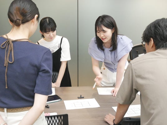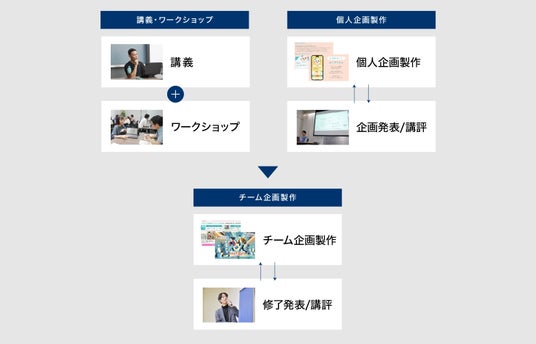 授業では、各講師陣による講義だけではなく、ワークショップを通して思考法や視点を体系的に習得できます。さらに、前半で個人企画製作に取り組み、「課題を見つける力」を養います。後半では、チームでの企画製作を通じ、多様な視点で「アイデアを形にする力」を磨き、「実社会への応用」まで実践的に学ぶことができます。