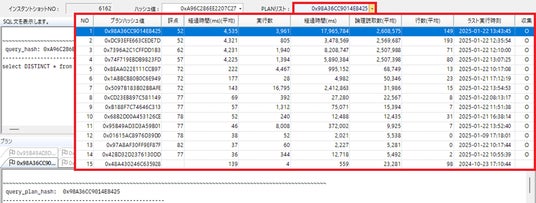 - SQL単位での実行計画(PLAN)一覧表示機能SQLごとに実行されたプランの一覧を表示し、最適な実行計画を即座に特定。パフォーマンスチューニングの精度向上を実現し、システムの安定性を確保します。