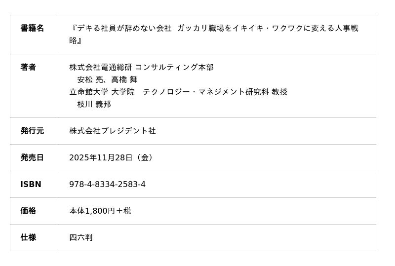 テクノロジーで企業と社会の進化を実現する株式会社電通総研(本社:東京都港区、代表取締役社長:岩本 浩久、以下「電通総研」)は、コンサルティング本部の安松 亮、高橋 舞と立命館大学 大学院 テクノロジー・マネジメント研究科 枝川 義邦教授が共同で執筆した書籍「デキる社員が辞めない会社 ガッカリ職場をイキイキ・ワクワクに変える人事戦略」を、株式会社プレジデント社より2025年11月28日(金)に刊行したことをお知らせします。