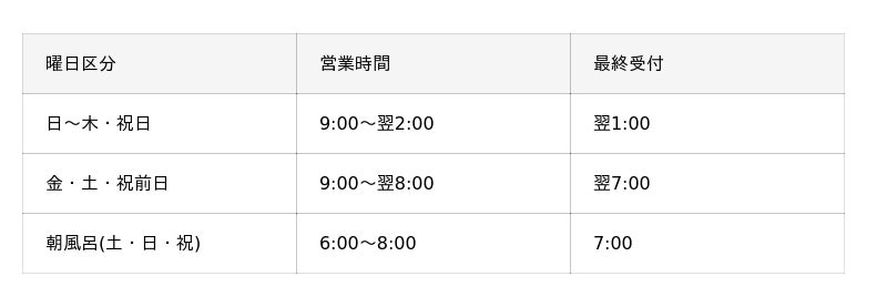 ※お風呂・岩盤浴は翌2:00~翌6:00の間はご利用いただけません。