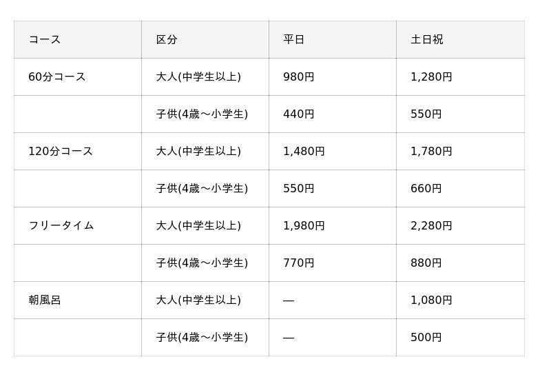 12月5日(金)のグランドオープン以降の営業時間およびご利用料金は以下の通りです。