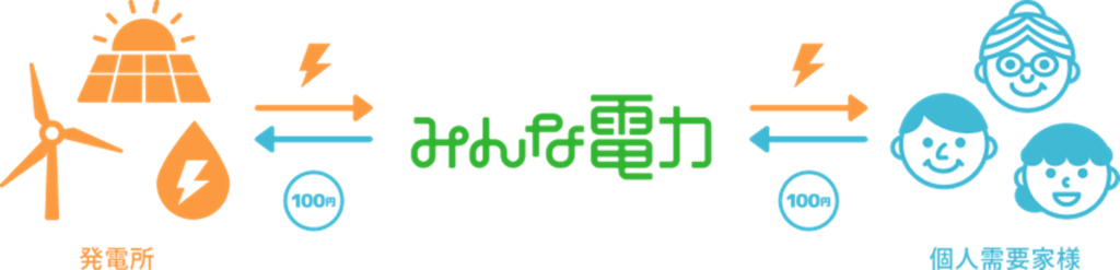 みんな電力は「顔の見える再生可能エネルギー100%※」。コンセントの向こう側にいる再生可能エネルギーの電気の生産者の顔や想いといったストーリーを見える化し、電気を選択する楽しさやワクワクを生み出しています。