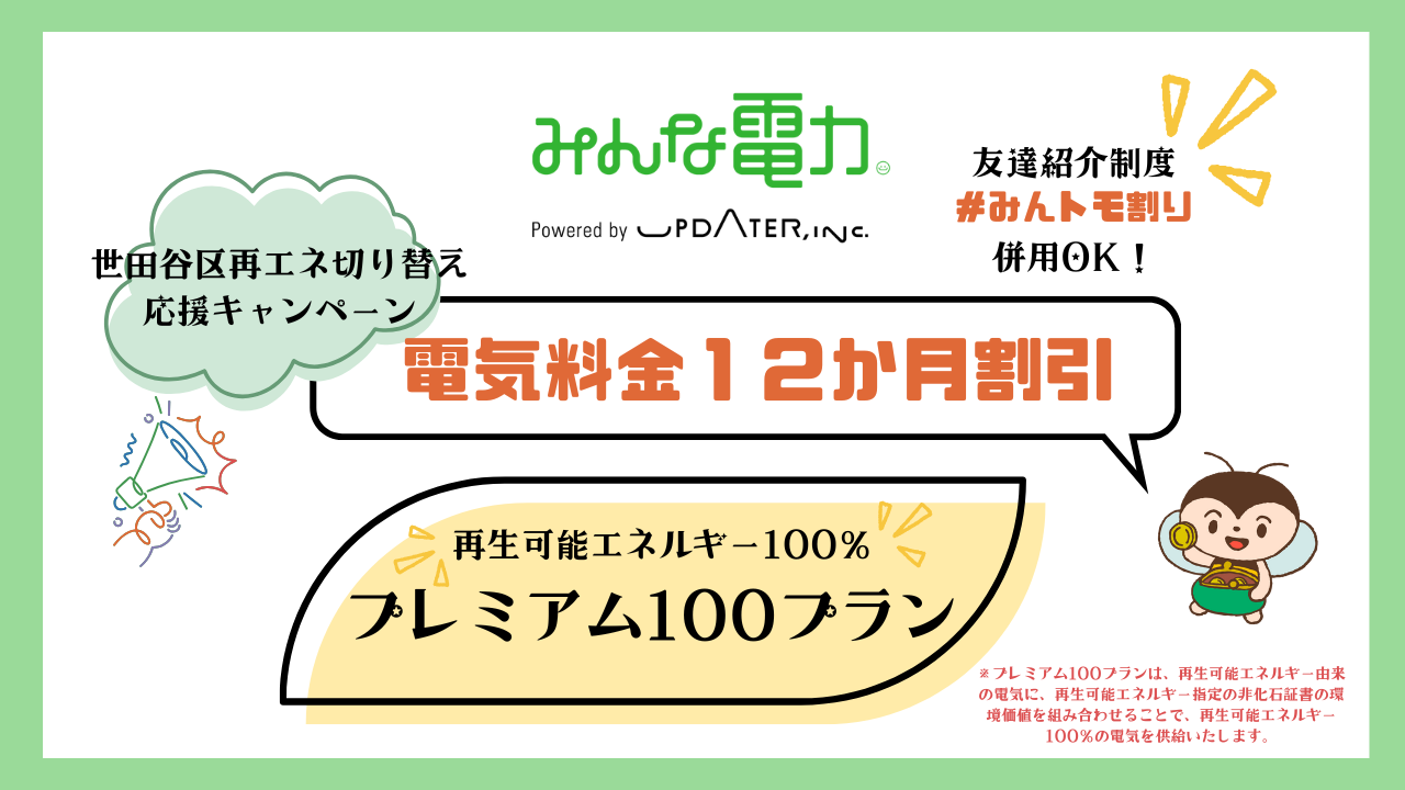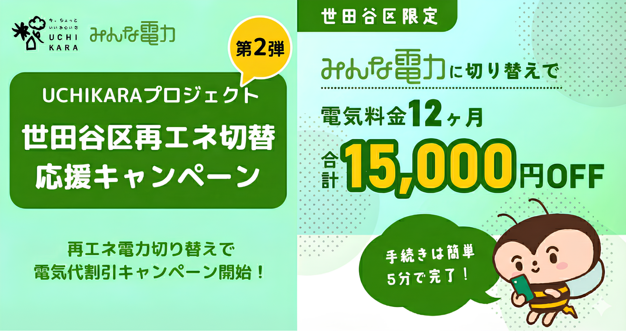 社会課題をオモシロく解決する企業、株式会社UPDATER(本社:東京都世田谷区、代表取締役:大石英司)が運営する再生可能エネルギー電力小売サービス「みんな電力」は、世田谷区が推進する脱炭素化プロジェクト「UCHIKARA(うちから)プロジェクト」と連携し、2025年12月1日(月)より「世田谷区再エネ切替応援キャンペーン(第2弾)」を開始します。