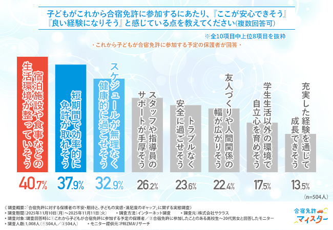 保護者が感じる「安心できそうな点」では合宿所での生活環境が1位に!合宿免許参加で子どもに期待する変化とは…
