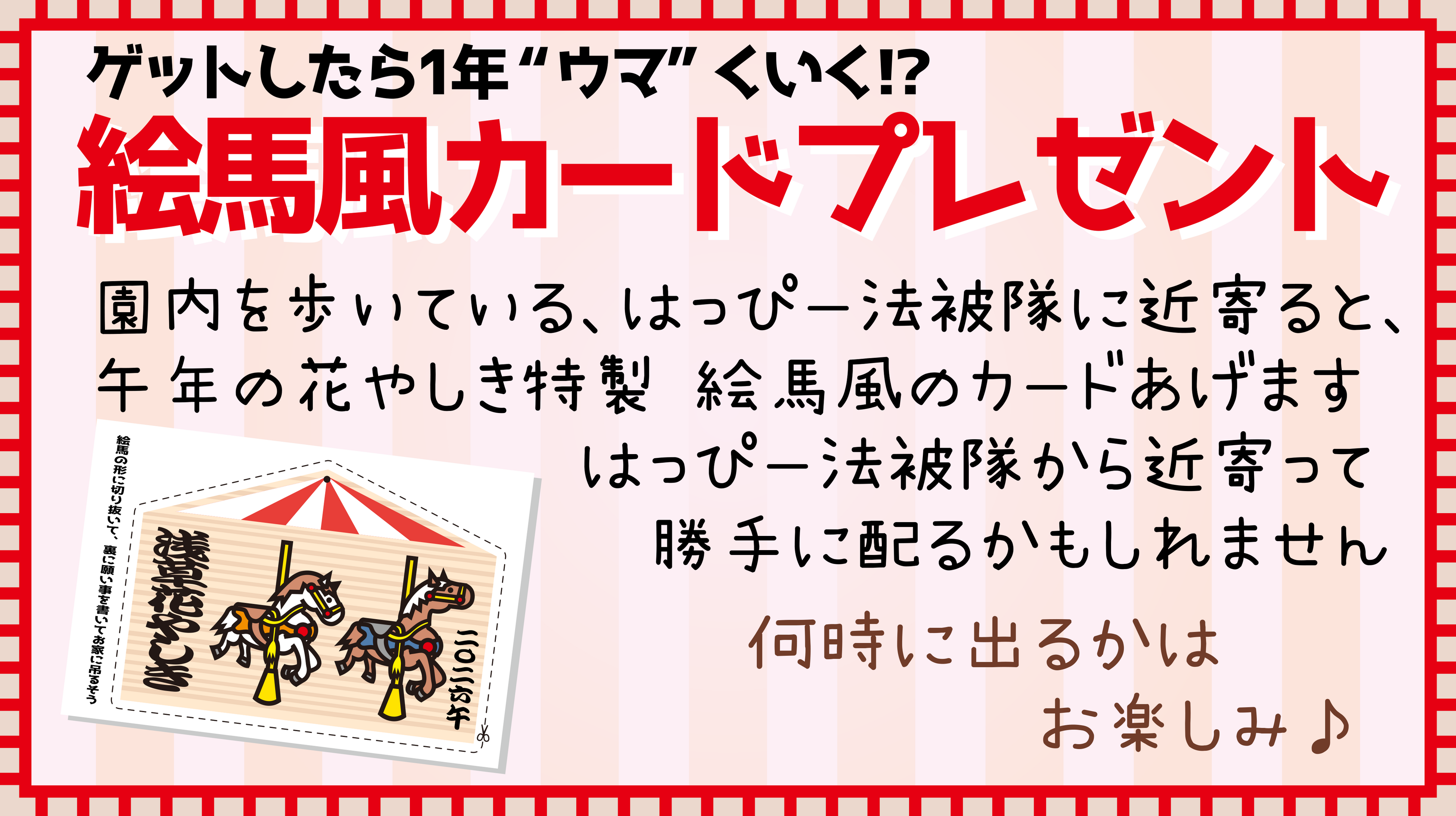 園内のどこかにはっぴー法被隊が出現します。「2026年の干支」を答えてくれた方には「絵馬風カード」をプレゼントします。