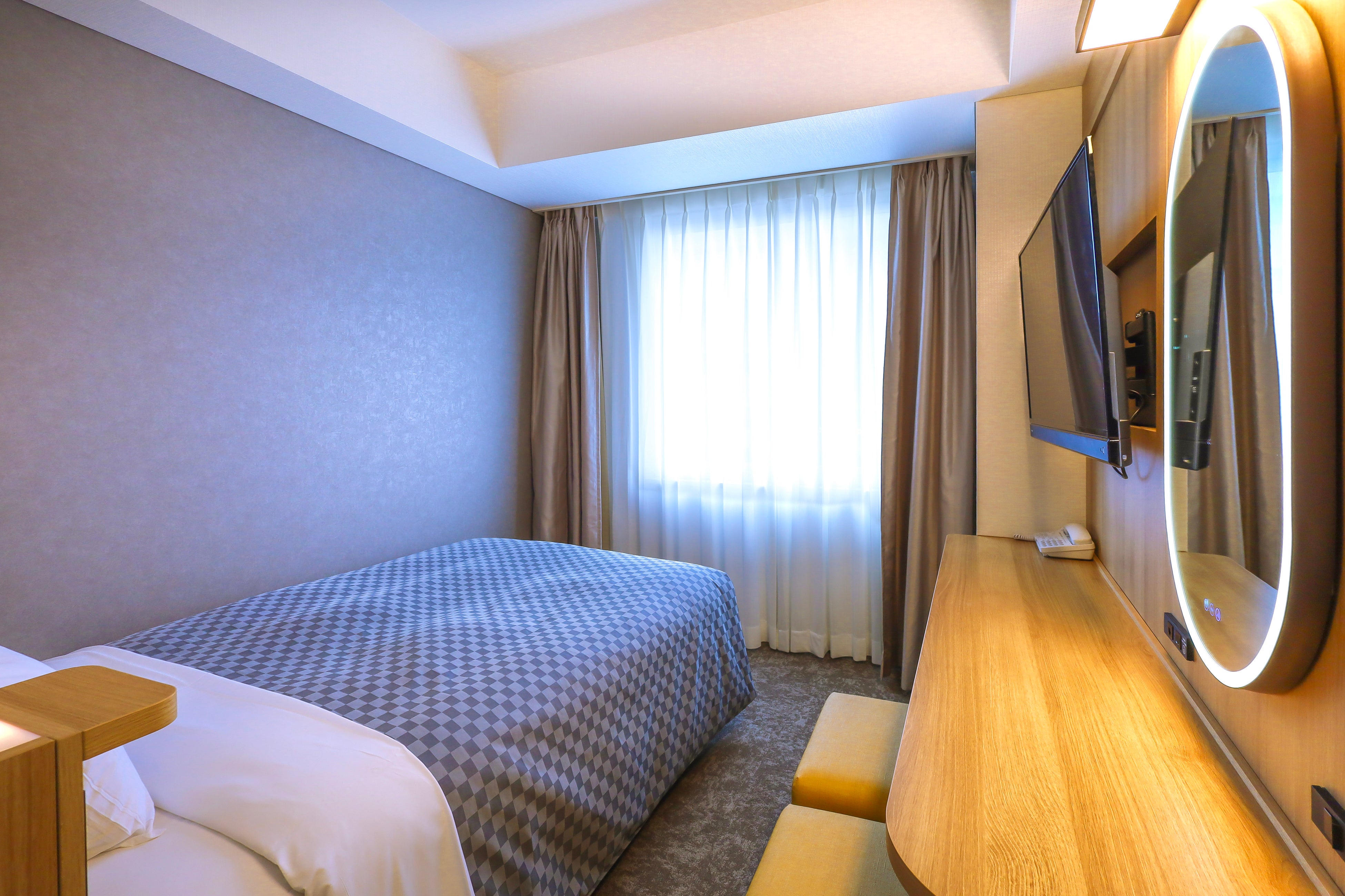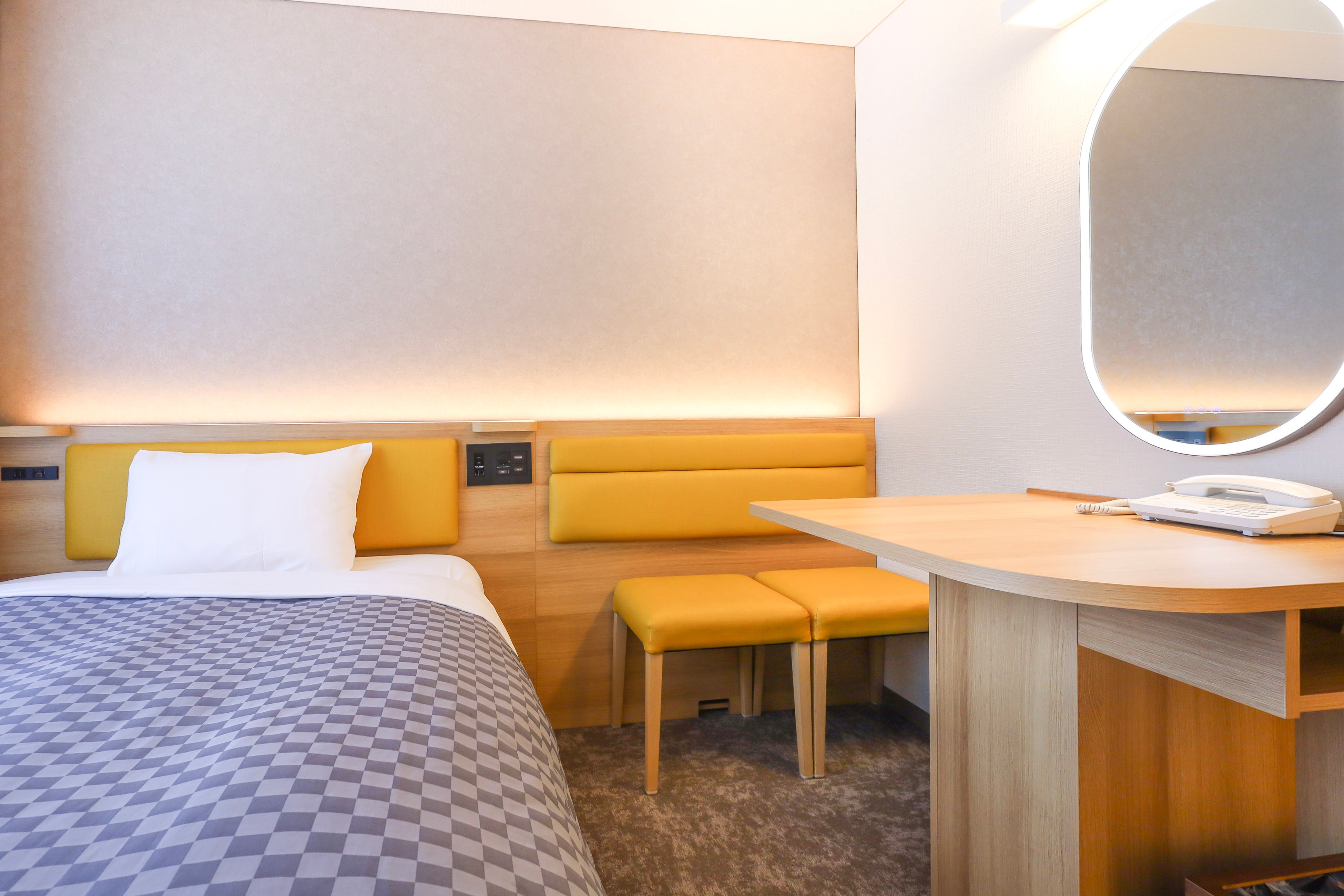 当ホテルの客室は、より快適で過ごしやすい空間づくりを目指し、温かさと利便性を兼ね備えたデザインに生まれ変わりました。リニューアルした客室には4つの特徴があります。1つ目は、「暖色系を基調とした温かみのある空間」です。やわらかな光に包まれ、心身の疲れを癒しながらリラックスしたひとときをお過ごしいただけます。2つ目は、「壁掛けタイプのテレビ」の採用です。デスク周辺のスペースを確保し、より広々としたレイアウトを実現いたしました。3つ目は、「LEDライト付きミラー」を設置したことです。明るさと見やすさにこだわったカラーを採用し、朝の身支度やお化粧がよりスムーズに行えるようになりました。最後に、「シンプルで洗練されたインテリア」を採用しました。無駄をそぎ落したデザインが空間の広がりを演出し、快適な居住性を実現します。