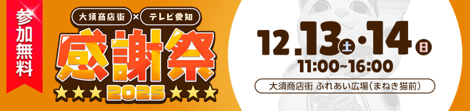 テレビ愛知では、2025年12月13日(土)・14日(日)名古屋・大須で「大須商店街×テレビ愛知 感謝祭2025」を実施します。