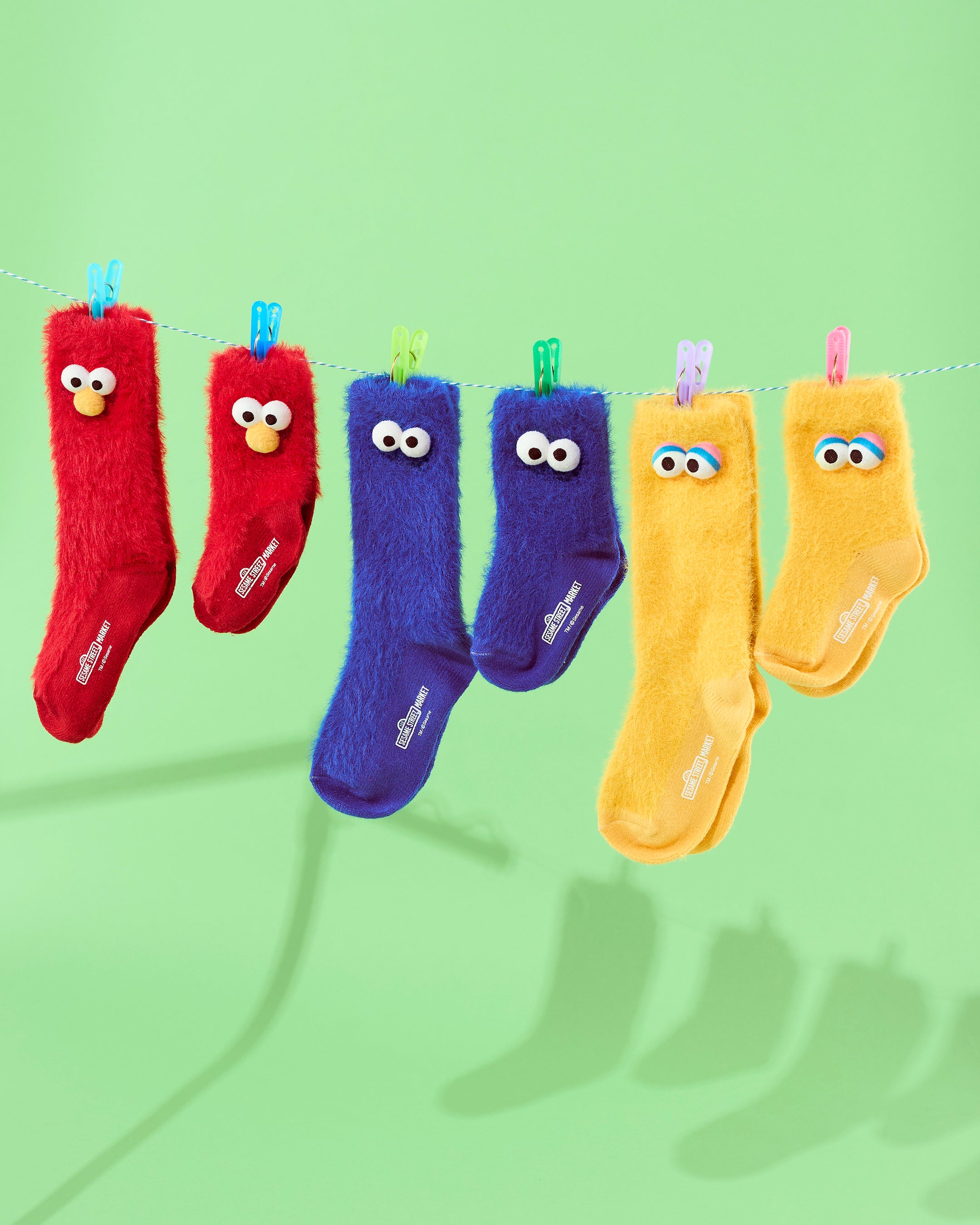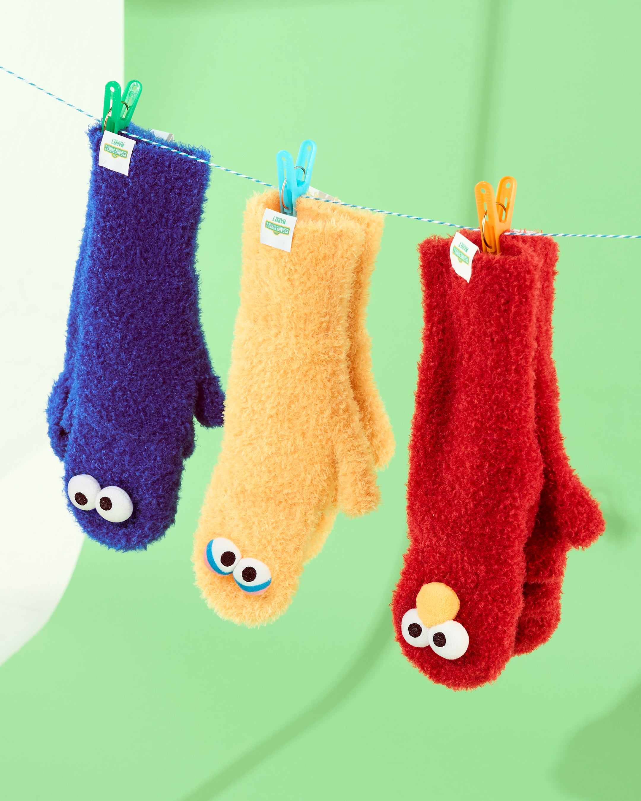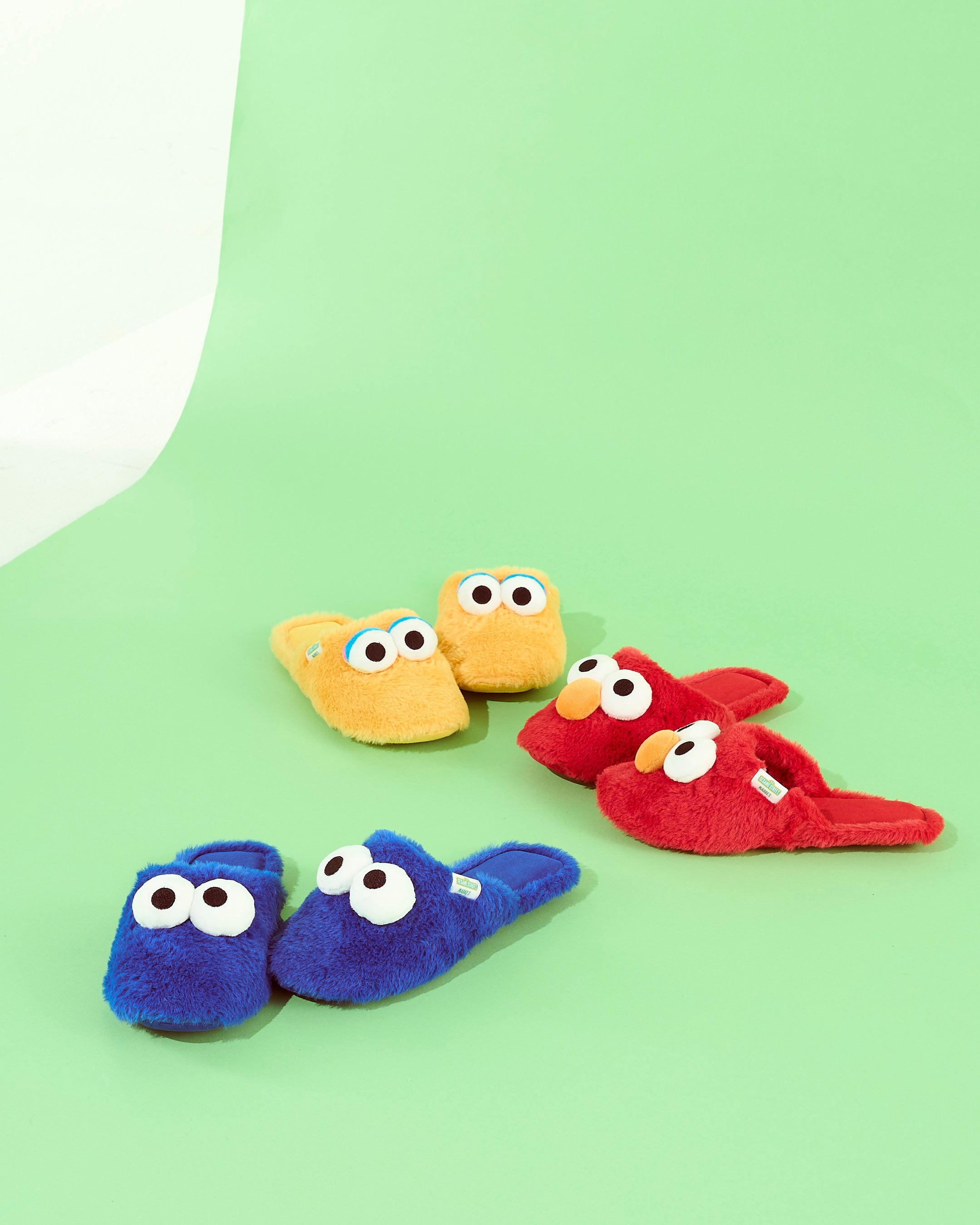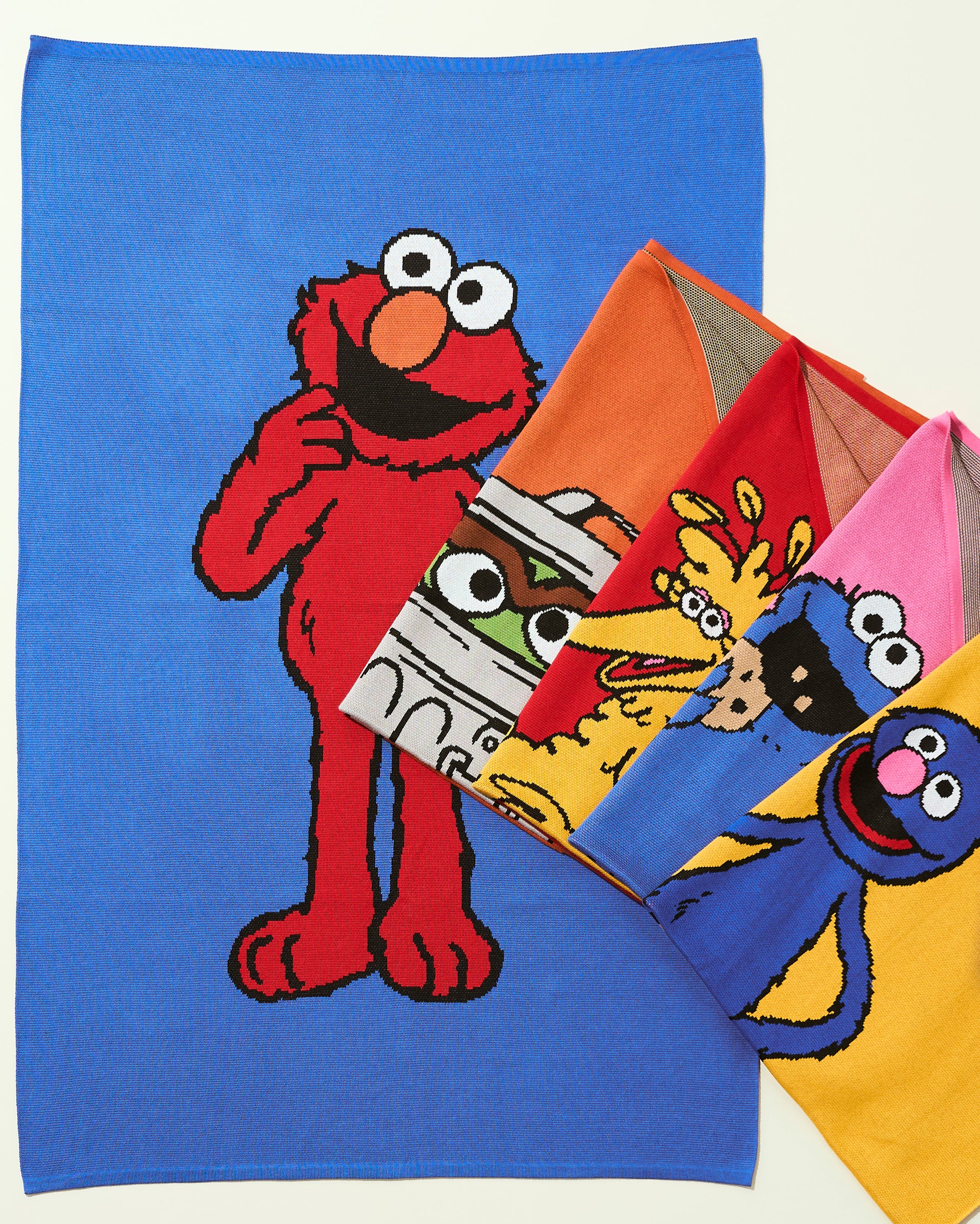 (二枚目左より:ブルー(エルモ)、オレンジ(オスカー)、レッド(ビッグバード)、ピンク(クッキーモンスター)、イエロー(グローバー))