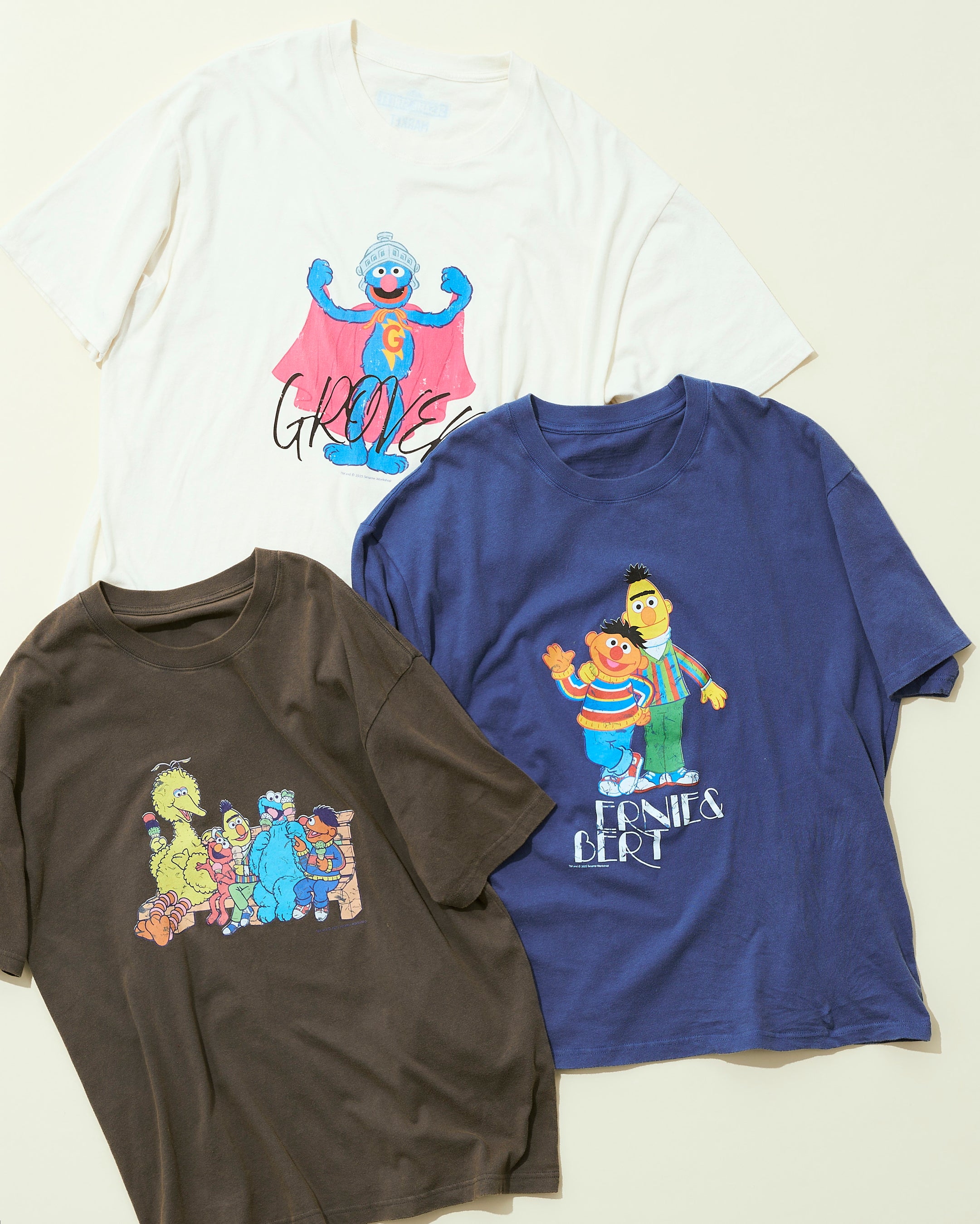 (二枚目上より時計回り:オフホワイト(スーパーグローバー)、ブルー(アーニー&バート)、グレー(キャラクター集合))