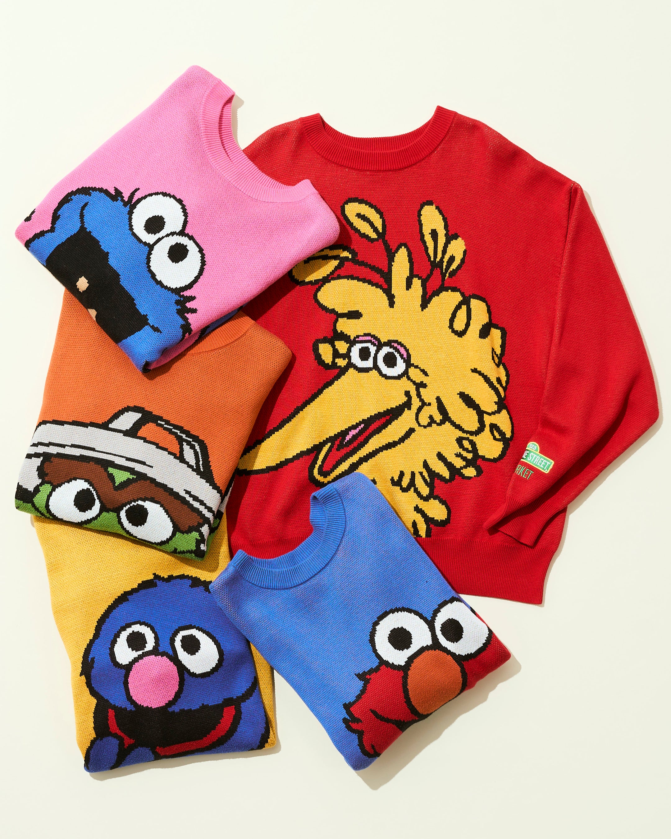 ビビッドなカラーとダイナミックなキャラクターのアートが目を惹く、インパクト抜群のニットプルオーバー。どこか懐かしさを感じさせるヴィンテージタッチのアートで、エルモ、クッキーモンスター、ビッグバード、オスカー、グローバーの全5種をラインアップ。お気に入りのキャラクターで選ぶのはもちろん、お好みのカラーで選ぶのもおすすめです。