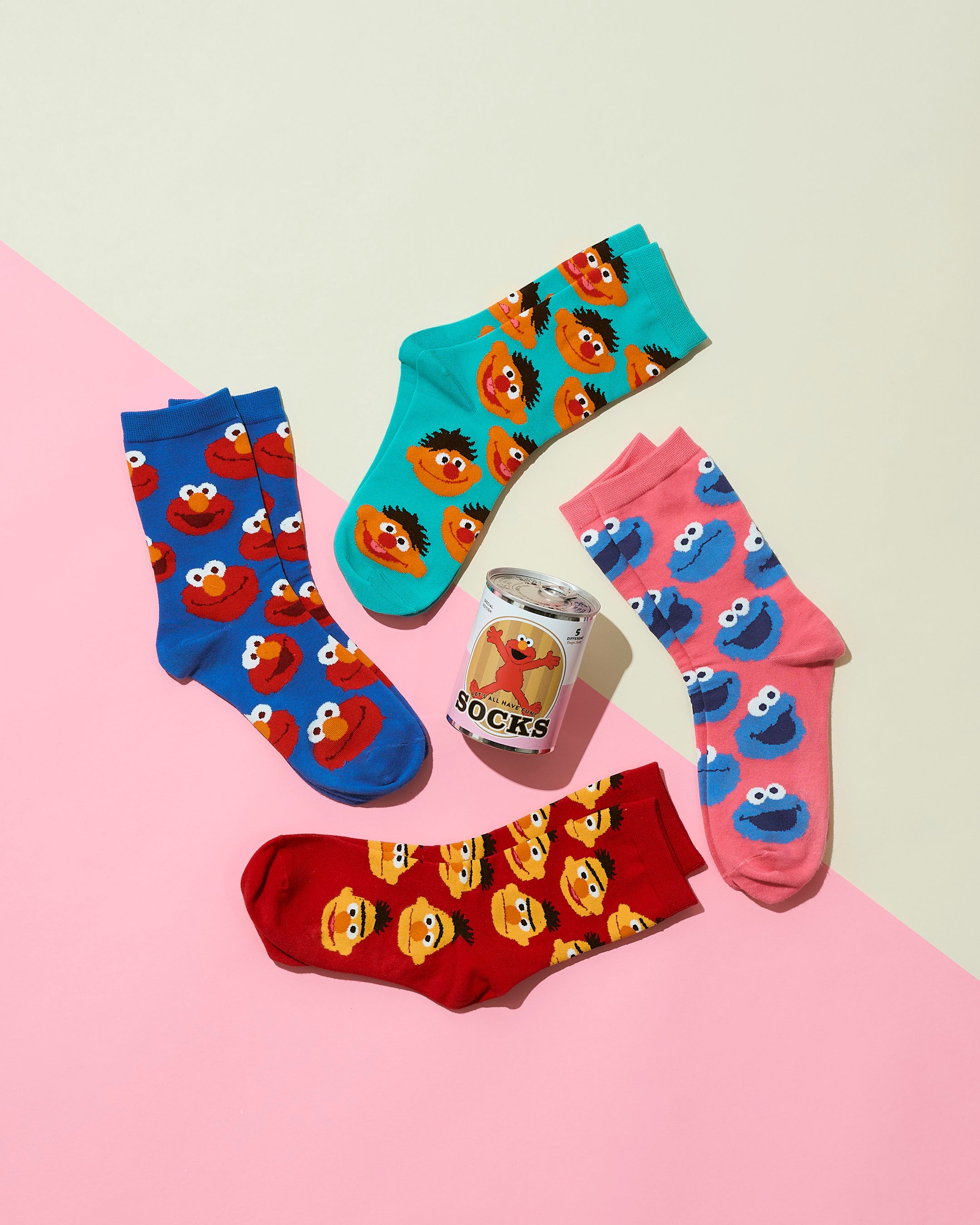 元気いっぱいのエルモが描かれた缶に、キャラクターたちの総柄とビビッドなカラーリングが目を惹くソックスが入ったシークレット缶が新登場。全5種類のデザインをご用意しており、うち1種は“シークレット”デザイン。どのデザインが入っているかは開けるまでは分からない、ドキドキ感をお楽しみいただけます。
