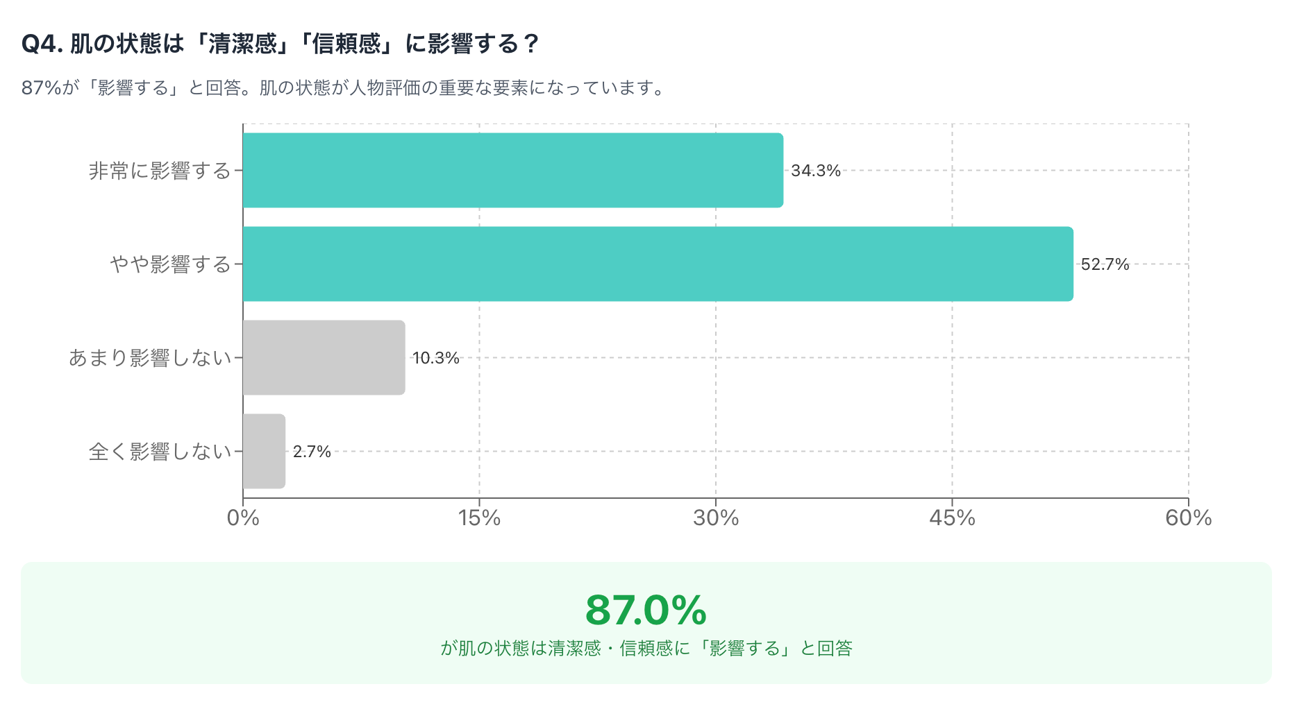 特に「清潔感」への影響を指摘する声が多く、ビジネスシーンやプライベートの人間関係において、肌の状態が重要な評価要素となっていることが示されました。