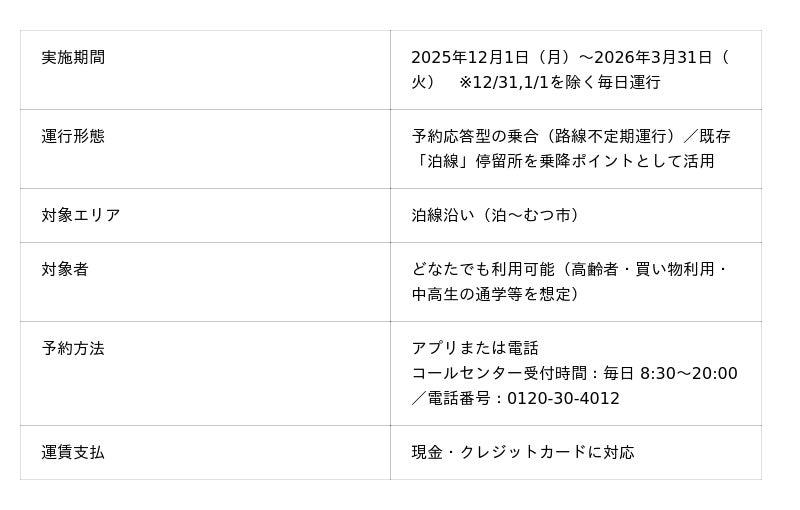 既存の「泊線」ルートと既設バス停を活用した“路線バス連携型デマンド”で、交通空白を段階的に解消