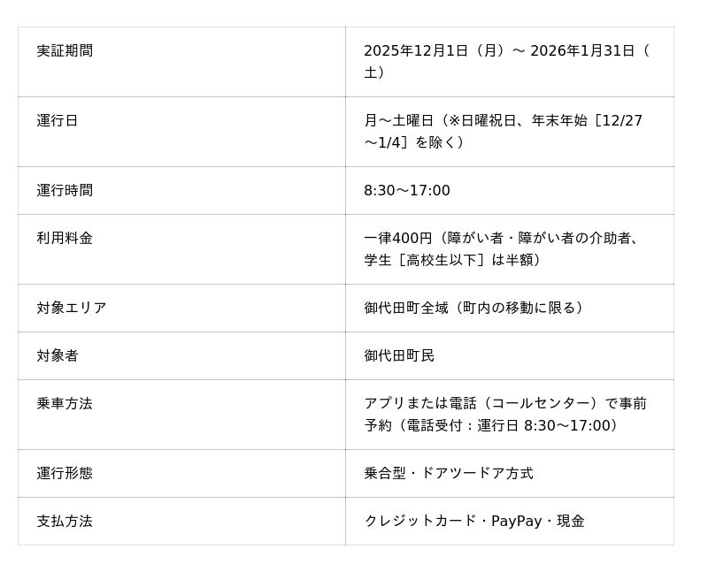 地方自治体向けスーパーアプリ「パブテク」やAIを活用した行政支援ツール「パブテクAI行政」を開発・運営する株式会社パブリックテクノロジーズ(本社:東京都中央区、代表取締役社長 CEO:青木大和、以下「当社」)は、長野県御代田町(以下、「御代田町」)と連携し、国土交通省「交通空白解消等リ・デザイン全面展開プロジェクト」(*1) の「交通空白」解消緊急対策事業(*2)を活用した「御代田町公共ライドシェア」の実証運行を2025年12月1日(月)より開始します。本事業は、当社サービスの「パブテクAI配車」を用い、御代田町全域を対象に実施。町民の方々の通院・買い物・習い事の送迎など、日常の移動をドアツードアで支える新しい公共交通モデルの検証を行います。