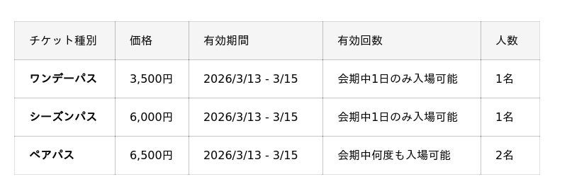※ワンデーパス及びペアパスは3/13-15のいずれかの1日のみ有効、シーズンパスは3/13-15の会期中何度もご入場頂けます。