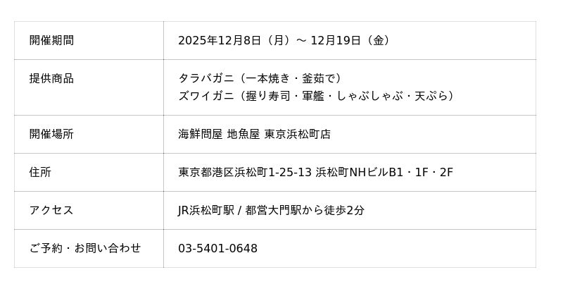 海鮮問屋 地魚屋 浜松町店(所在地:東京都港区、運営:(株)焼肉坂井ホールディングス)は、2025年12月8日(月)から12月19日(金)の期間、一年の締めくくりにふさわしい豪華な冬の味覚を堪能できる「かにフェア」を開催いたします。新鮮な鮮魚にこだわる「地魚屋」だからこそ提供できる、上質なかに料理を心ゆくまでお楽しみいただけます。
