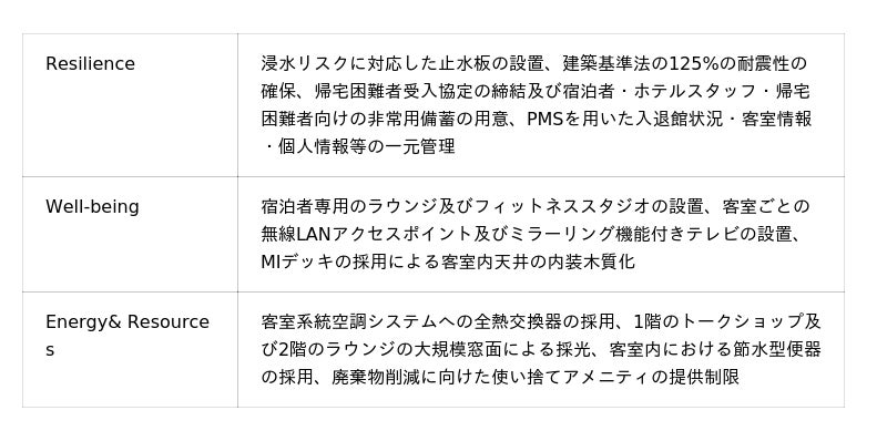 本ホテルは当社のサステナブルな街づくりを体現するホテルとして、木造ハイブリッド構造※の採用をはじめとした積極的な環境負荷低減施策の導入、防災・防犯対策および地域コミュニティーとの連携等に注力しております。今後もホテル運営者であるハイアット社とともに、環境や社会に配慮した様々な取り組みを行うことで、日本橋兜町・茅場町の魅力ある街づくりをさらに推進してまいります。