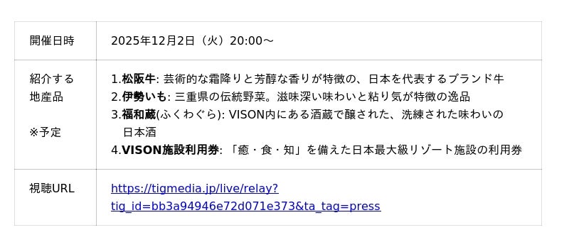 本パッケージの本格提供に先駆け、三重県多気町を舞台とした実証ライブコマースを2025年12月2日(火)に実施します。当日は、日本が誇るブランド牛「松阪牛」や、日本最大級のリゾート施設「VISON(ヴィソン)」など、同地域の“食と体験”の魅力をリアルタイムで全国の視聴者へお届けします。