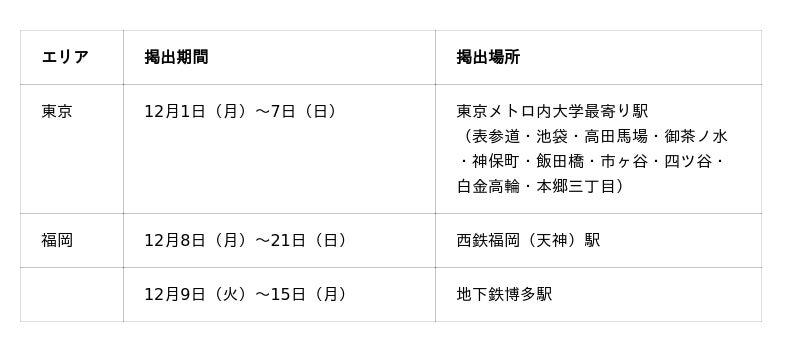 また、12月8日(月)からは福岡市内の西鉄福岡(天神)駅及び地下鉄博多駅でも順次掲出を予定しており、本社を構える福岡と東京の両エリアにおいて、私たちの考え方や働く姿勢を広くお届けしてまいります。