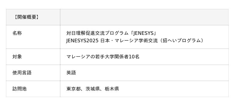 外務省が推進する対日理解促進交流プログラム「JENESYS」の一環として、マレーシアの若手大学関係者10名が下記の日程で東京都、茨城県、栃木県を訪問します。