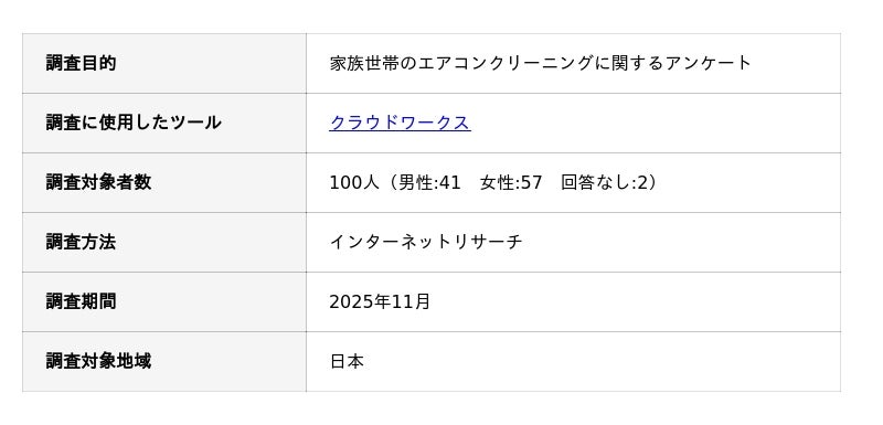 家族世帯のエアコンクリーニングに関するアンケート調査の概要
