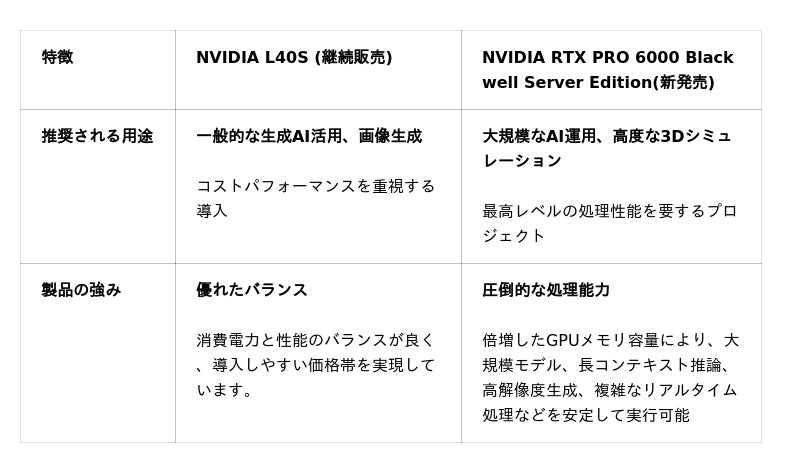 これにより、お客様は「コストと電力効率のバランスに優れたL40S」と「圧倒的な処理性能を持つRTX PRO 6000 Blackwell Server Edition」の2つの選択肢から、事業規模や用途に合わせて最適なサーバー環境を選択可能となります。