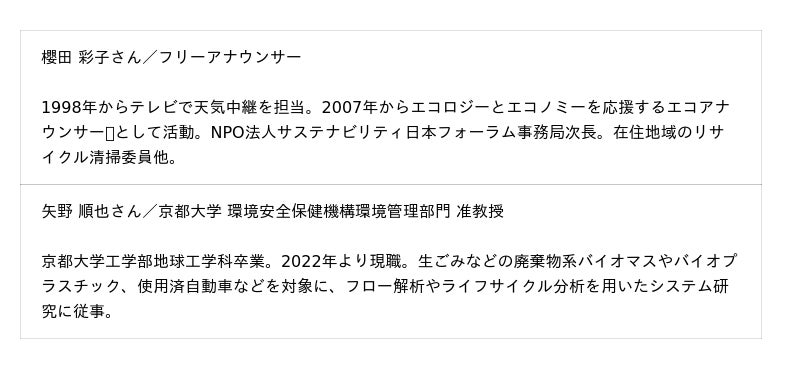 イベント第1部の講演は、フリーアナウンサーの櫻田彩子さんと京都大学准教授の矢野順也さんが登壇します。地球温暖化防止などの環境保全推進団体を応援する「エコアナウンサー(R)」として活動する櫻田さんは、ガラスびんや一人ひとりの暮らし方の選択による持続可能な社会づくりの可能性を伝えます。循環型社会システムなどを研究する矢野さんは、びんリユースによる環境負荷削減への貢献を説明します。