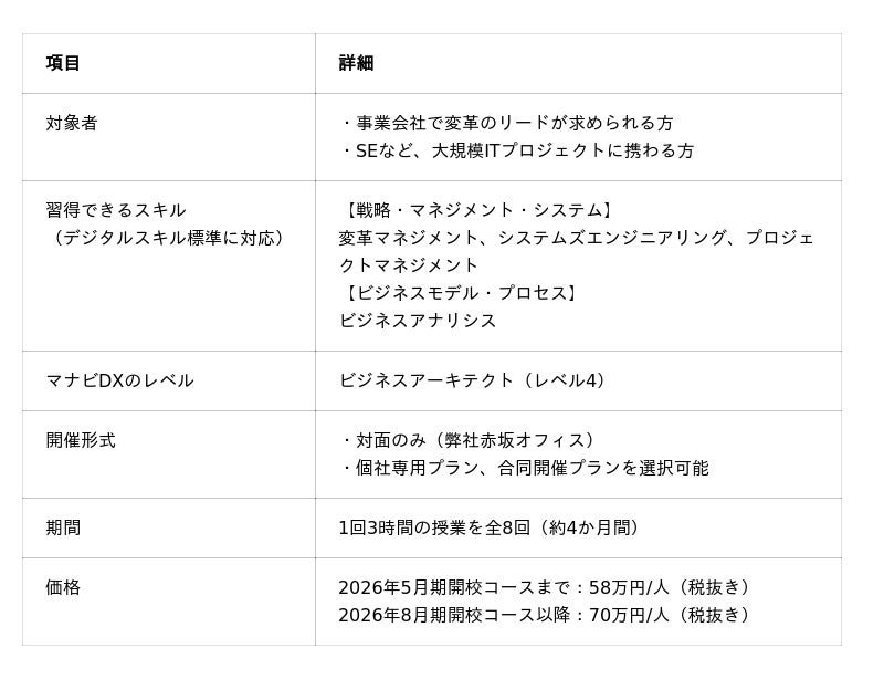ケンブリッジ・テクノロジー・パートナーズ株式会社(本社:東京都港区、代表取締役社長:榊巻 亮、以下 ケンブリッジ)は、企業向け研修サービス「プロジェクトリーダーおよびプロジェクトチーム養成学校」の講座「Scope コース(システム開発上流)」が、2025 年 10 月 29 日付で経済産業省および独立行政法人情報処理推進機構(IPA)が運営する「マナビ DX」において、ビジネスアーキテクト育成講座として掲載されたことをお知らせします。