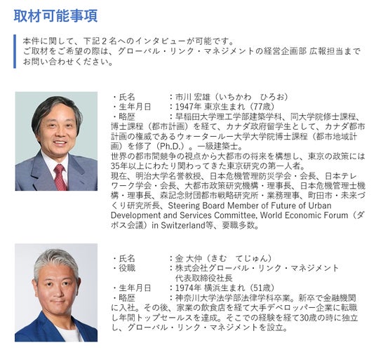 投資用不動産を扱う株式会社グローバル・リンク・マネジメント(本社:東京都渋谷区、以下GLM)は、(1)東京という都市を分析しその魅力を世界に向けて発信すること、(2)不動産を核とした新しいサービスの開発、等を目的に、明治大学名誉教授 市川宏雄 氏を所長に迎え、「グローバル都市不動産研究所(以下、同研究所)」を2019年1月1日に設立しました。