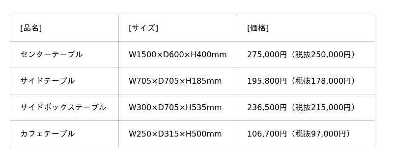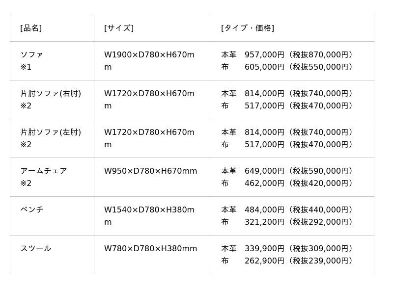 価格(税込)は、「ソファ」605,000円~、「片肘ソファ(右肘・左肘)」517,000円~、「アームチェア」462,000円~、「ベンチ」321,200円~、「スツール」262,900円~の5種類に加え、テーブルアイテムの「センターテーブル」275,000円~、「サイドテーブル」195,800円~、「サイドボックステーブル」236,500円~、「カフェテーブル」106,700円~をラインアップしています。